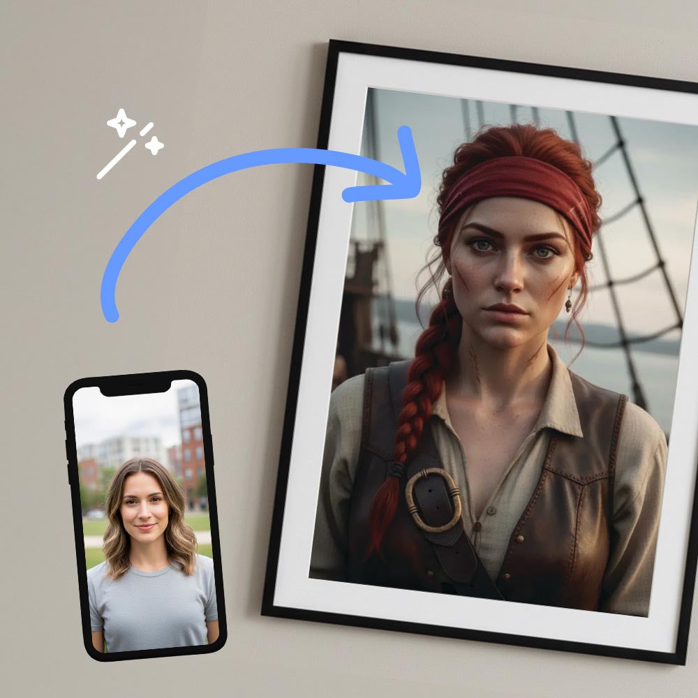 Hoist the Jolly Roger and become a legendary swashbuckler with this custom art print! Feed your photo to our AI and watch it conjure you as a fearless pirate, complete with all the adventure and mischief of the high seas. Perfect for history buffs, adventure seekers, or anyone ready to embrace their inner buccaneer. Frame sold separately.