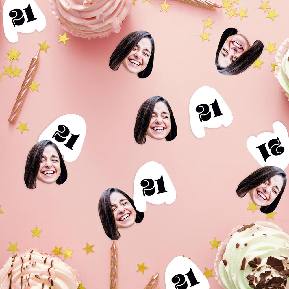 Decorate your party table in style with personalised face shaped photo table confetti. These face shaped confetti packs are a fun way to decorate your dinner table.
