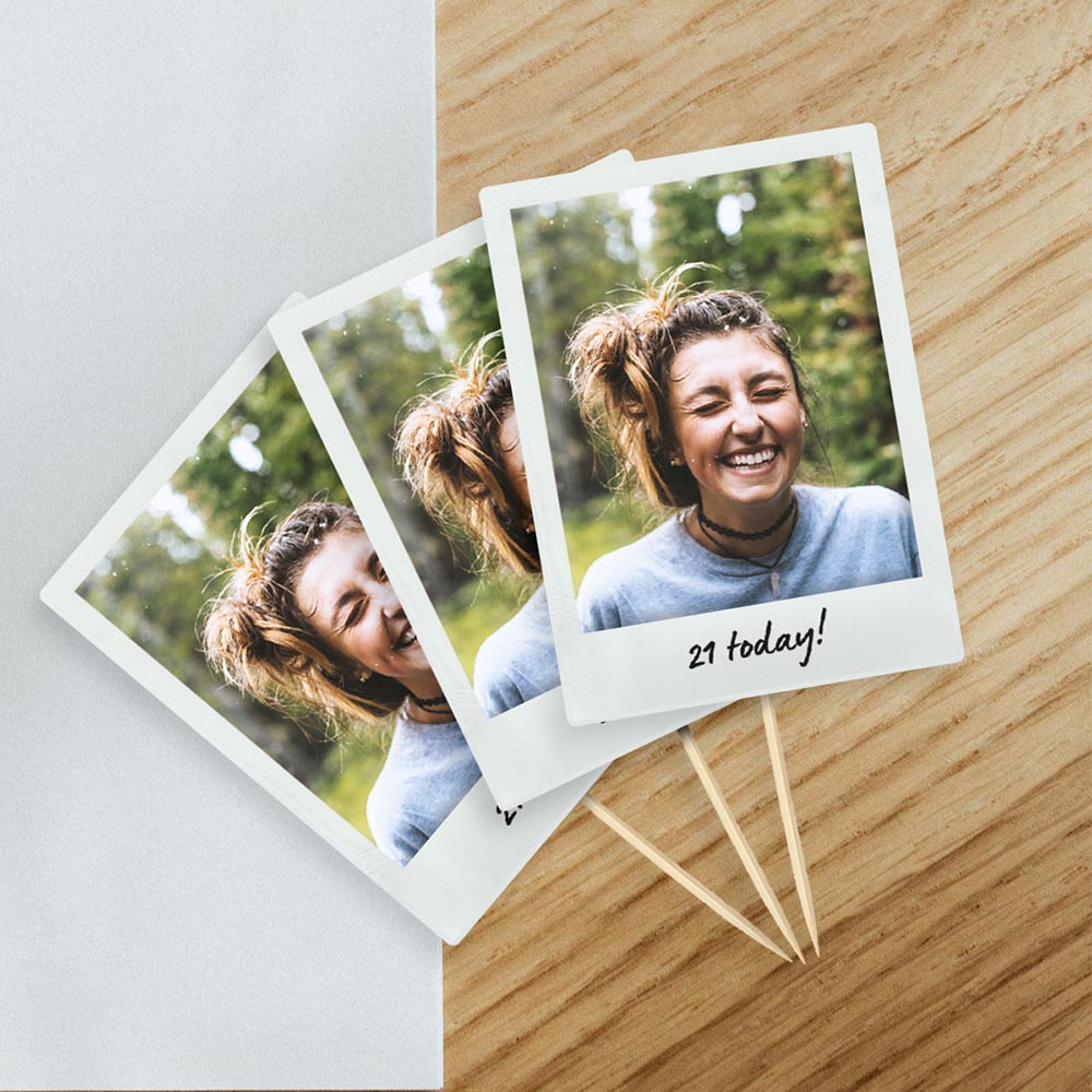 Decorate your Birthday Party table in style with personalised Polaroid photo-style Cake Toppers! Simply upload your photo, add a short message or age and we will do the rest! Cake Toppers are supplied printed, cut and fully assembled, with food safe bamboo skewers.