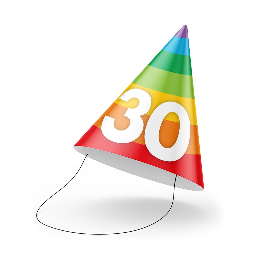 Bring the party atmosphere with these custom printed colourful Birthday Party Hats! Add the age and we will do the rest. Hats arrive flat packed - simply attach the elastic with the tabs provided and assemble your hats!